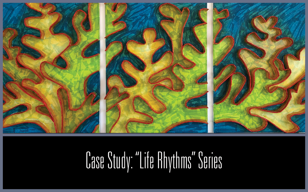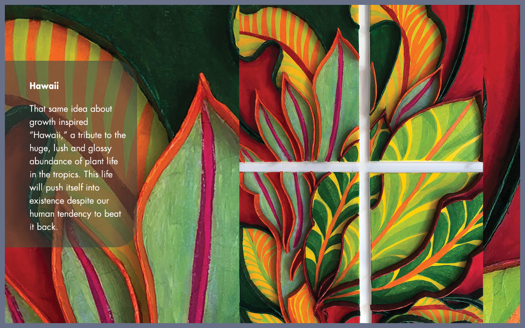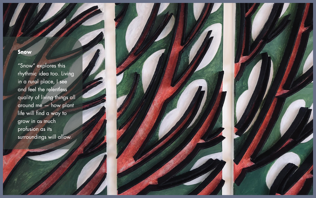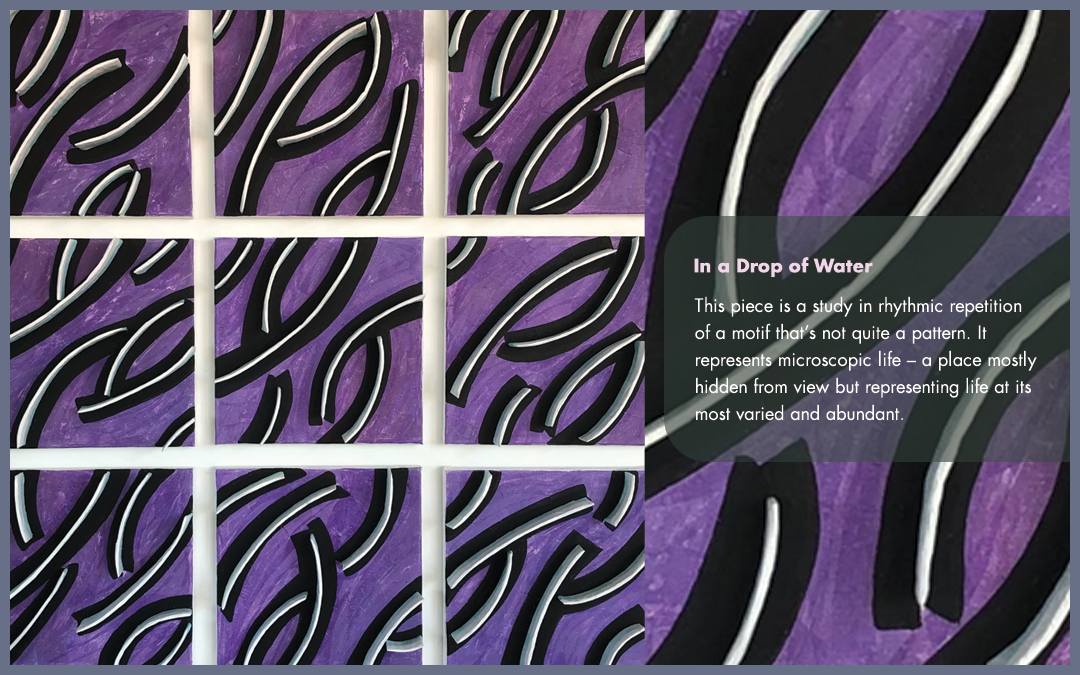 Playful and commanding, joyful and contemplative, the work is similar to collage but its own creation. The multi-panel pieces have a presence that works well in large venues, with sizes suited for a variety of spaces.